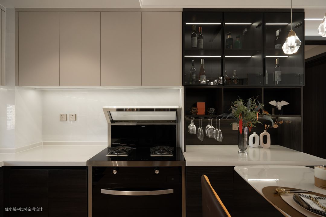 餐厨区域空间设计动线流畅,大理石餐桌与爱马仕橙色餐椅的搭配,彰显豪宅气质,没有过多的元素叠加与整体空间氛围相得益彰。