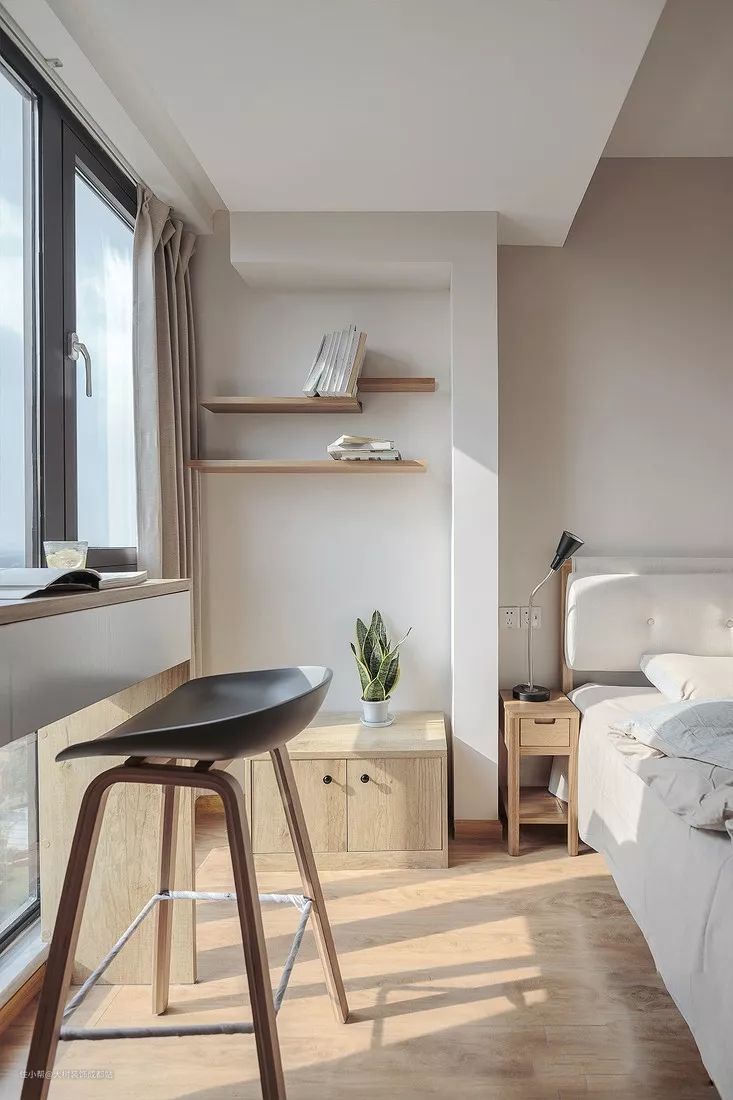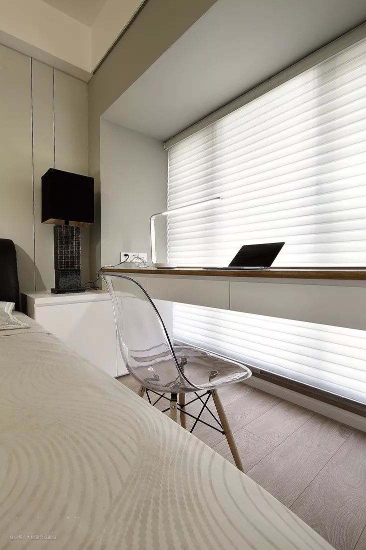 对于有睡前阅读、工作等习惯的业主而言,书桌靠窗的设计能最大面积地接触到自然光,很适合看书、写字。此外,作为梳妆台也是不错的选择。