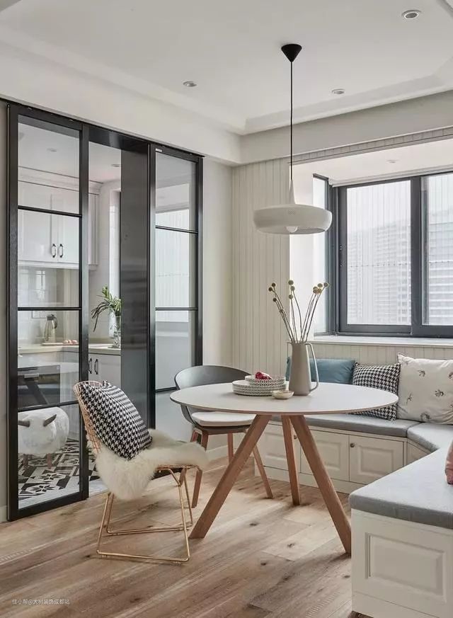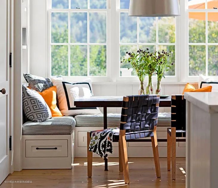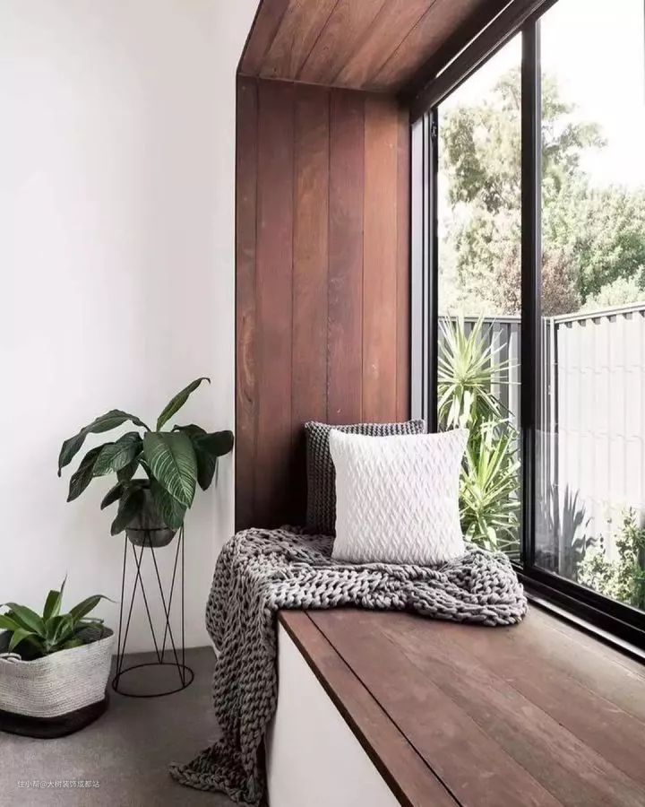 根据飘窗的尺寸,定制一个大小合适的垫子,再放几个抱枕,一个舒适的小空间就出来了。