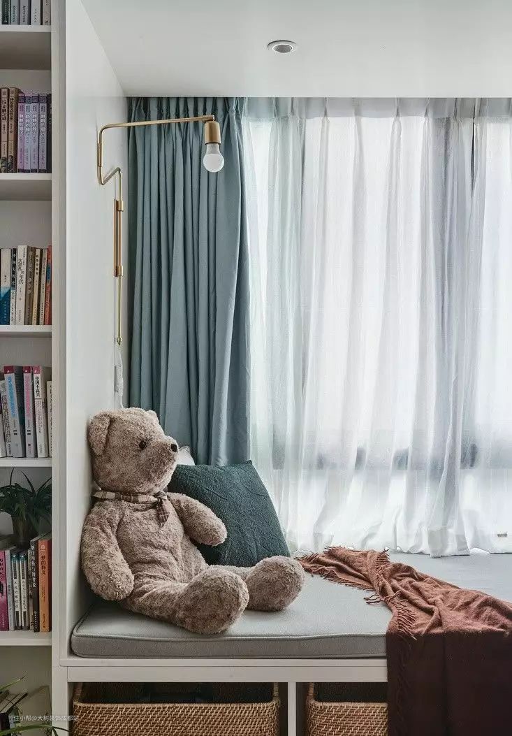 ② 开放式收纳:在飘窗底部做收纳格,怕灰尘可以搭配储物篮,放置日用品。