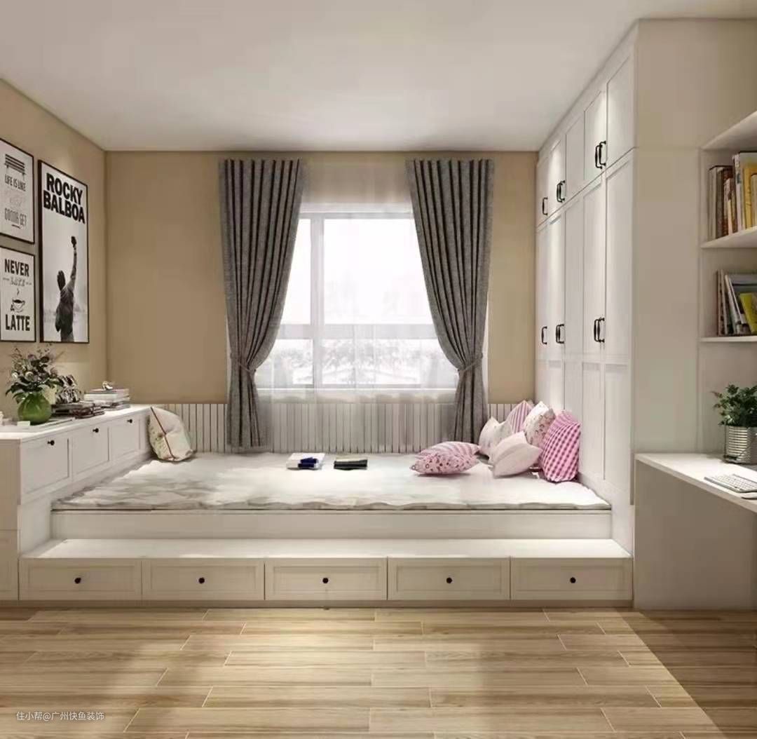 - 实在迷你的小户型卧室,可以把衣柜给舍弃,直接做上一个榻榻米地台,然后周边的墙面空间用上,做一些收纳设计,也能放下不少东西。
