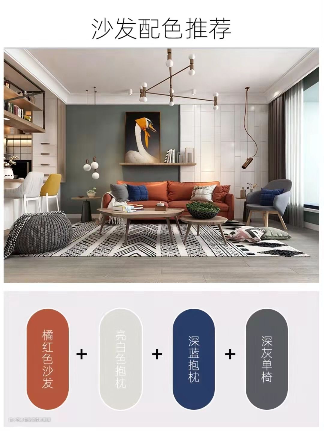 橘红色时尚又吸睛,让你的客厅整体颜值都up,其它颜色就相对没有亮眼了,搭配深灰色、深蓝色来平衡一下,让橘红色不会那么刺眼