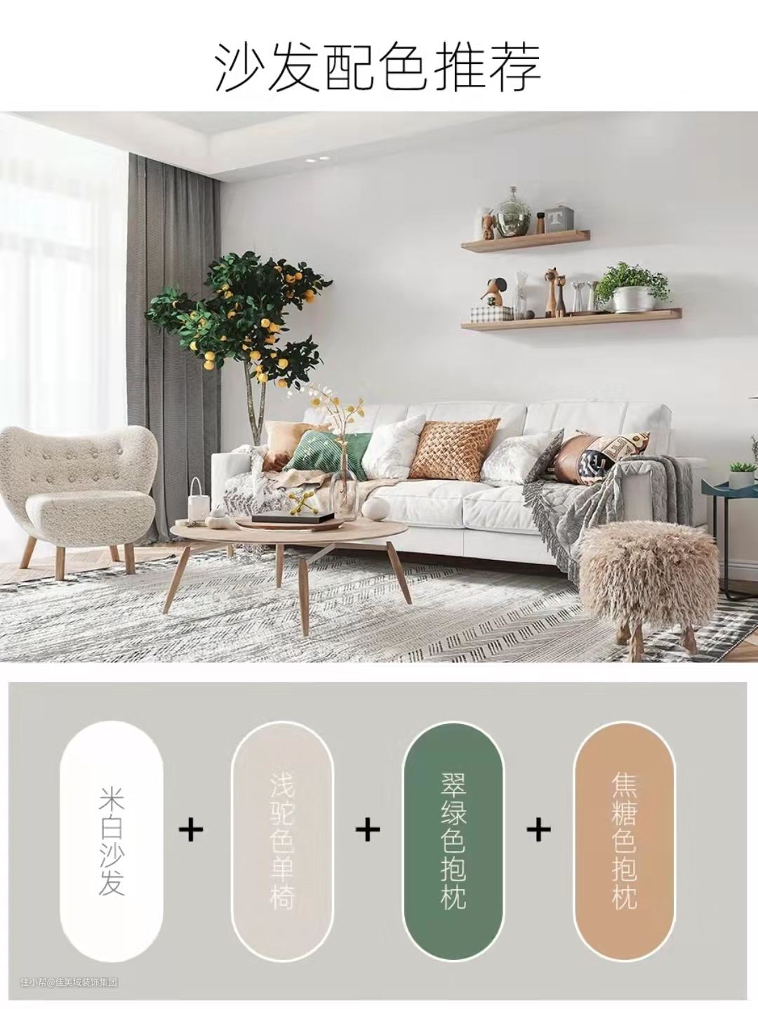 🔵米白沙发+浅驼色单椅+翠绿色抱枕+焦糖色抱枕: