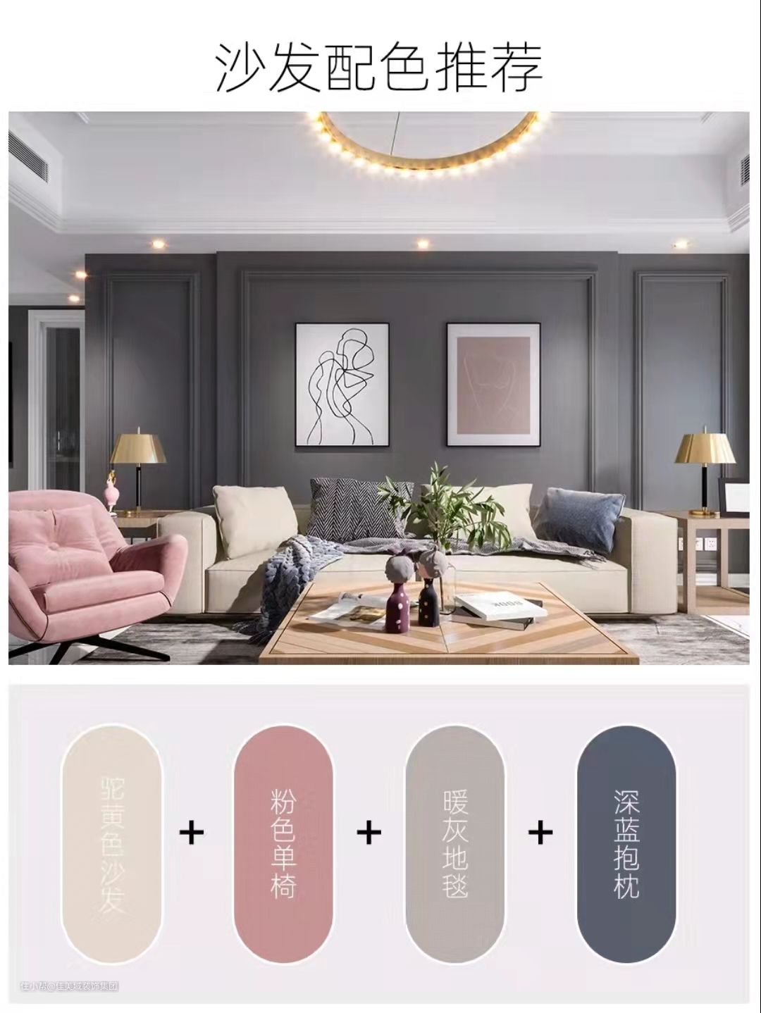🔵驼黄沙发+粉色单椅+暖灰地毯+深蓝抱枕