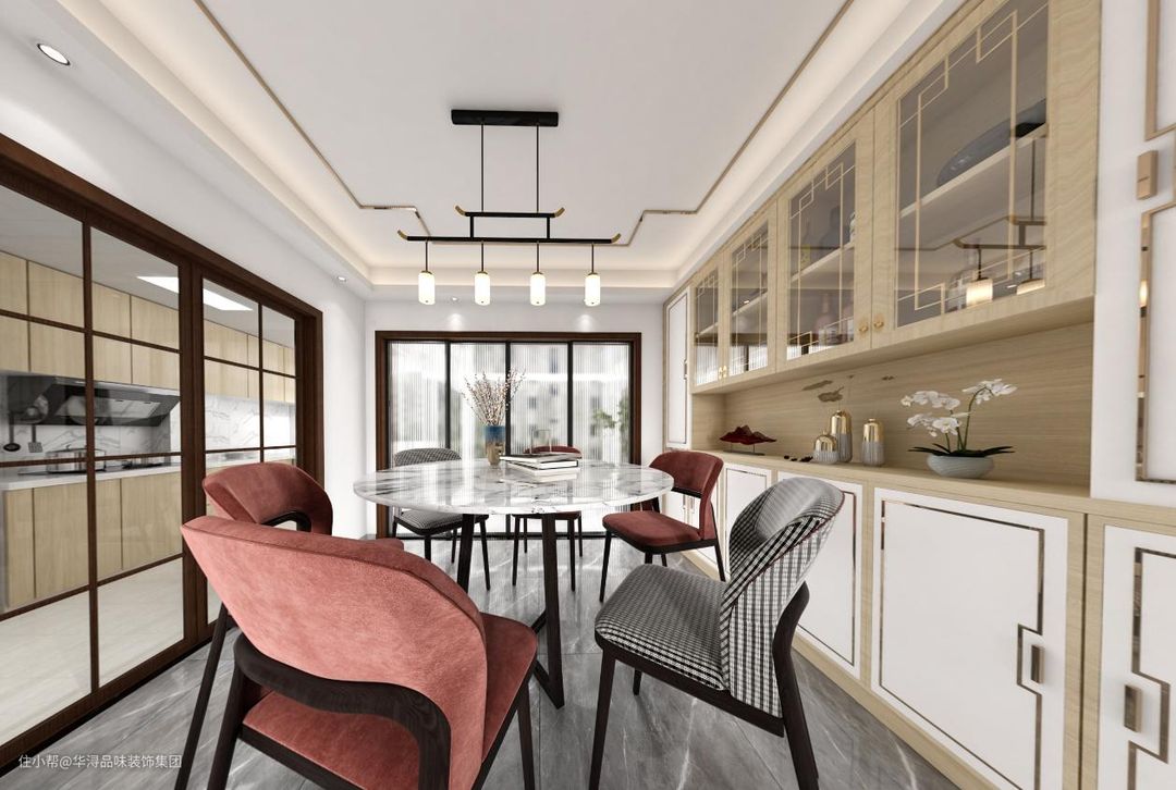 餐厅的布置用现代与中式相结合。一整面墙的浅色通顶酒柜,增加了餐厅的储物空间。玻璃柜门上对称的线条是中式风格特有的象征。