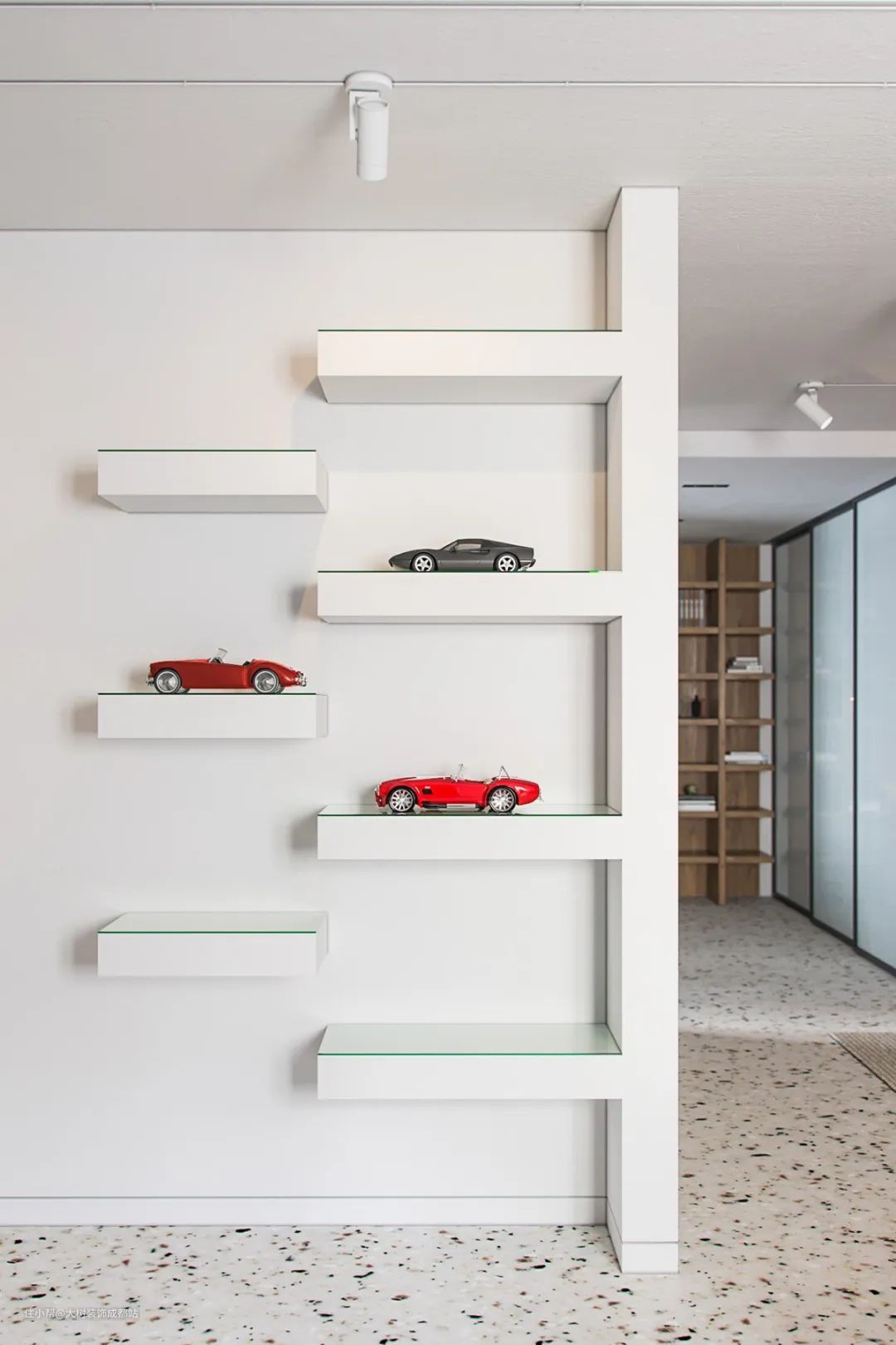 填充大白墙,置物架相对于画框来讲相对要更为实用一些,比较适合面积不大的户型,装饰的同时又增加了收纳空间。