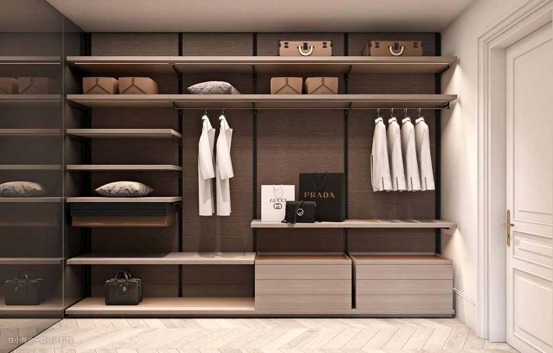 中间为长衣区,用于悬挂裙装和长款外套等,尺寸考虑在120cm-150cm左右。下方可根据需求做闲置物品的隔间。