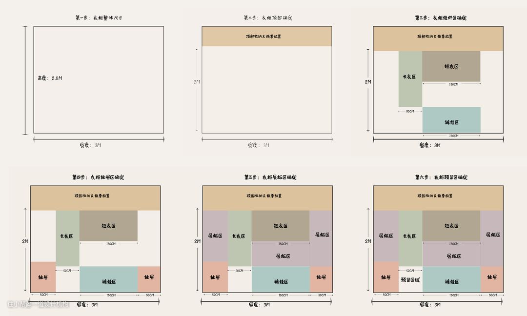 从确定衣柜整体大小开始→确定挂杆区域→确定抽屉区域→确定层板区域→确定预留区域→最终区域规划完成