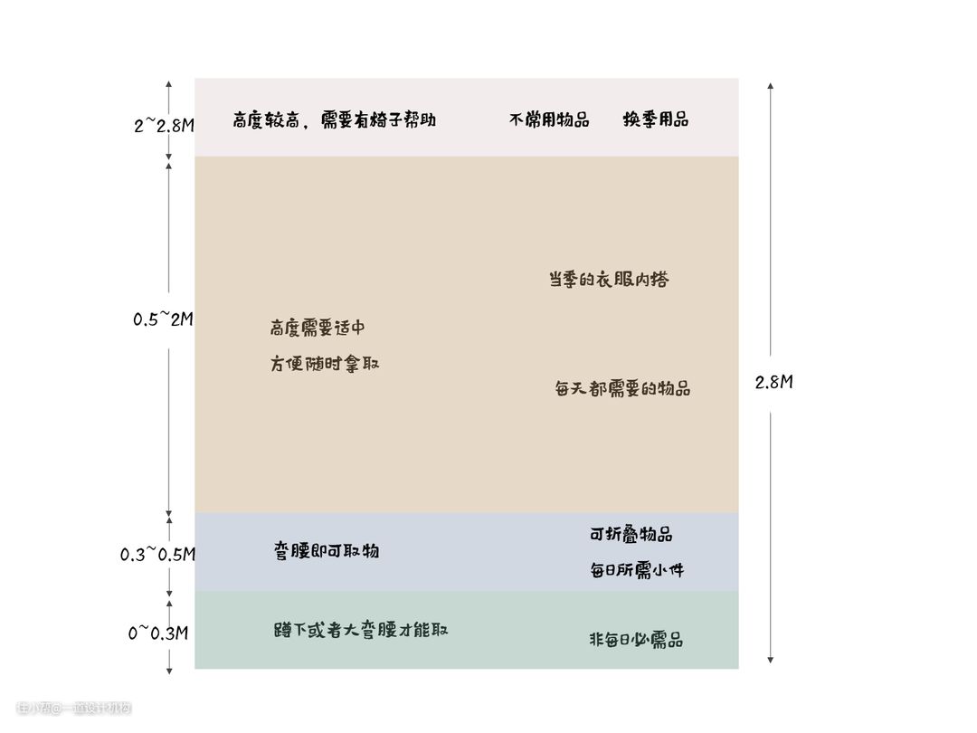 文字总结:被褥区,高度在50cm的样子,高度不适宜小于40cm,厚一点的被褥不好放。宽度根据实际情况,二分、三分或者4分。