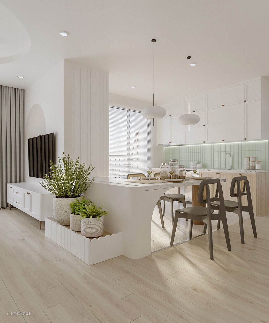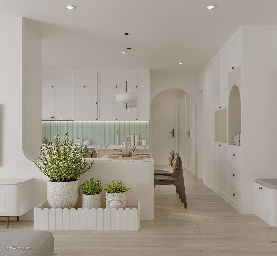 电视墙的结构向下弯曲以融入厨房半岛。一个可爱的白色尖桩篱笆花盆里有一排整齐的室内植物。