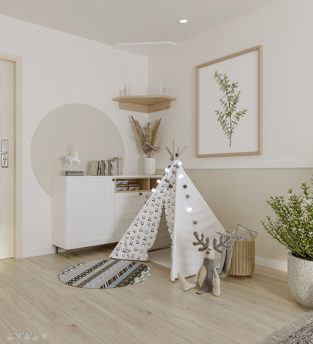 房间的一角设有儿童游乐区。一个有趣的织物帐篷搭配圆形地毯,与另一个彩绘圆形墙壁特征相得益彰。植物艺术和盆栽植物为游乐区带来了户外冒险的感觉。柳条筐可以保持玩具整洁。