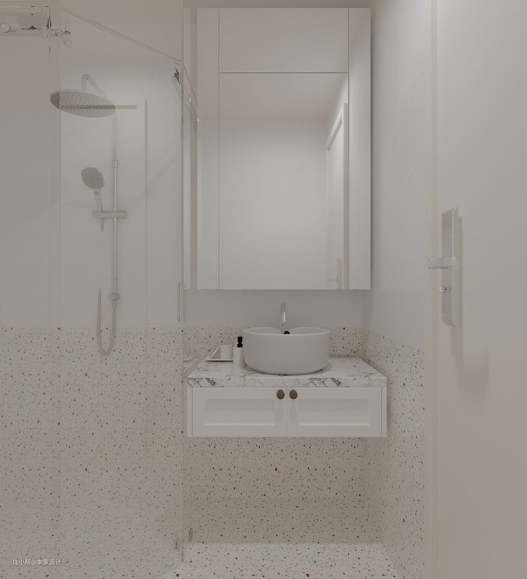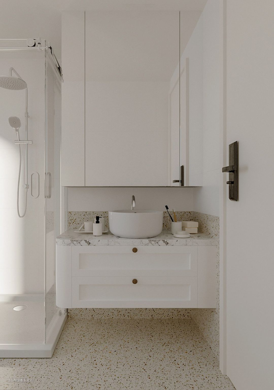 全白色的装饰方案为一间没有窗户的小淋浴房增光添彩。