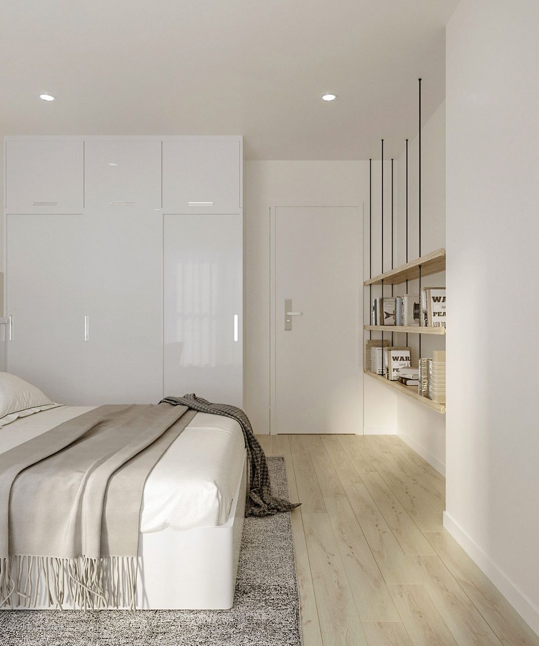 柔软的灰色卧室地毯与流苏地毯相得益彰。悬挂式书架在卧室门旁增添了一种有趣的感觉,在那里它们形成了图书馆的入口。