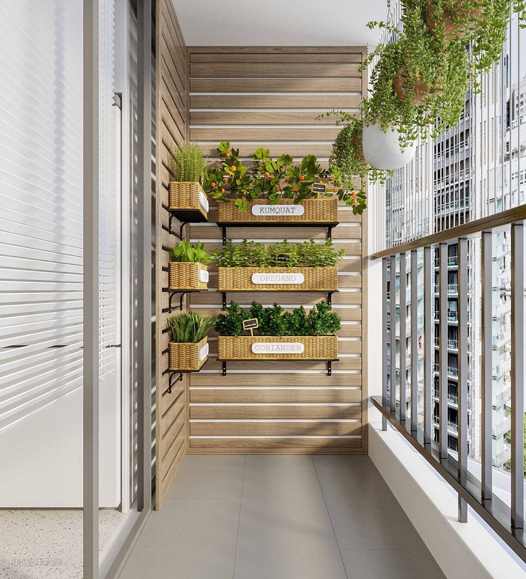 悬挂式植物和藤制壁挂花盆为阳台营造出花园般的感觉。