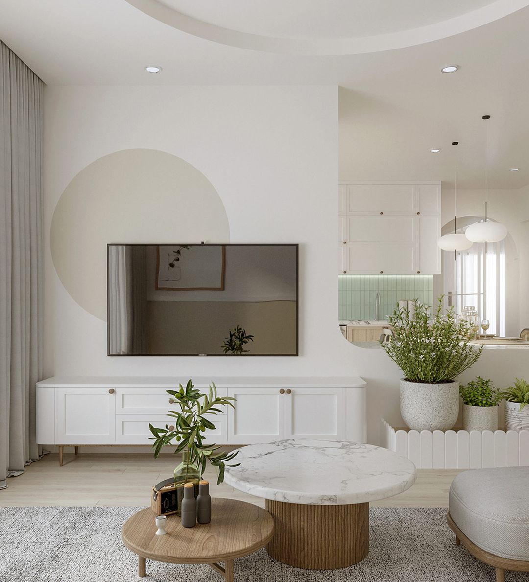 板条木支架为白色大理石圆形咖啡桌增添了现代风格。方形脚凳和线性现代沙发采用圆角柔和,以适应房间的美感。浅杏色靠垫为灰色沙发内饰增添了视觉上的温暖。