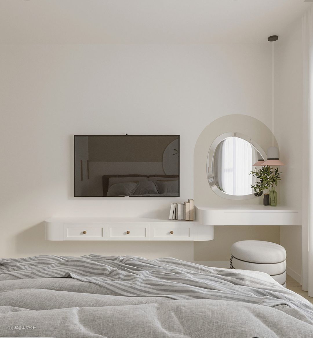 浮动的电视架和配套的梳妆台与衣柜的曲线造型相协调。圆形梳妆凳、自由造型梳妆镜和拱形墙壁细节增添了更多互补曲线。一盏小吊灯以甜美的粉红色点缀。