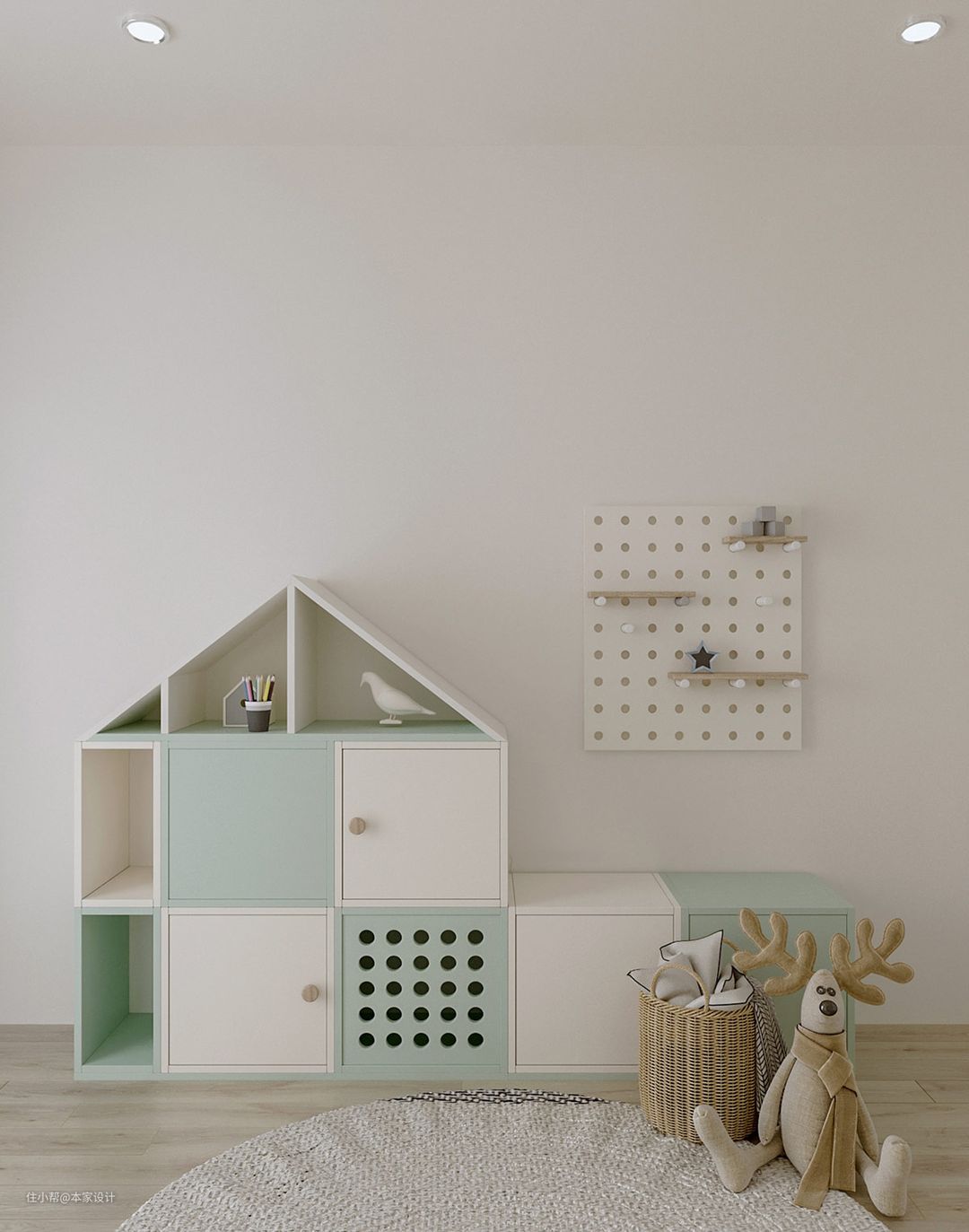 房子形状的玩具存储单元用薄荷绿色模块着色。一个圆形地毯柔软的游乐区倒在前面。