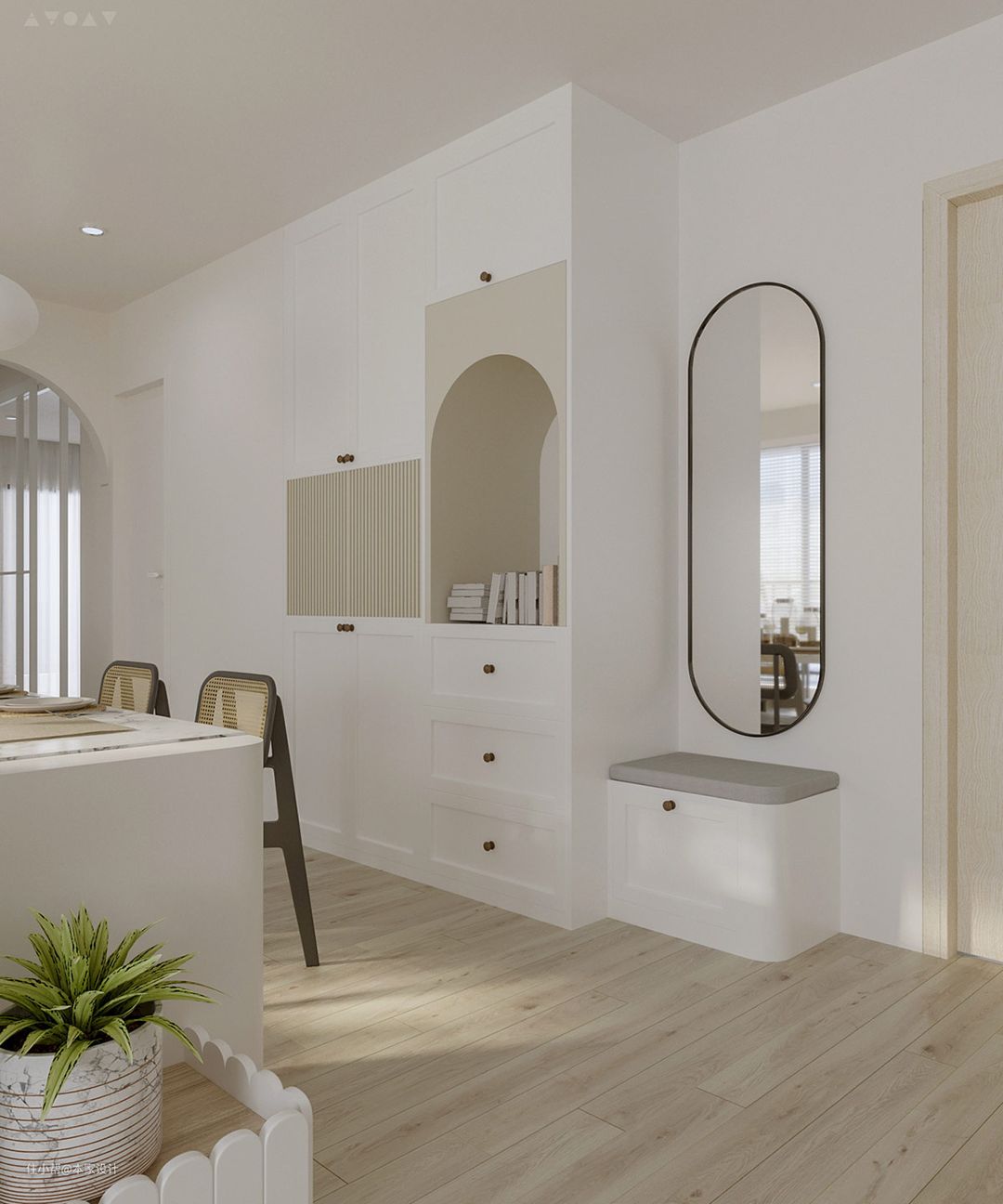 内置储物单元配有装饰性拱形书柜。拱门与前门的跑道形壁镜相得益彰,内置入口长凳隐藏鞋柜。