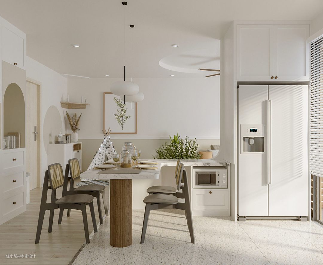 在半岛上方,优雅的灯具是Gino Sarfatti 为丹麦品牌 Astep 设计的2065 型 餐厅吊灯。暖灰色餐椅与白色大理石桌面形成鲜明对比。