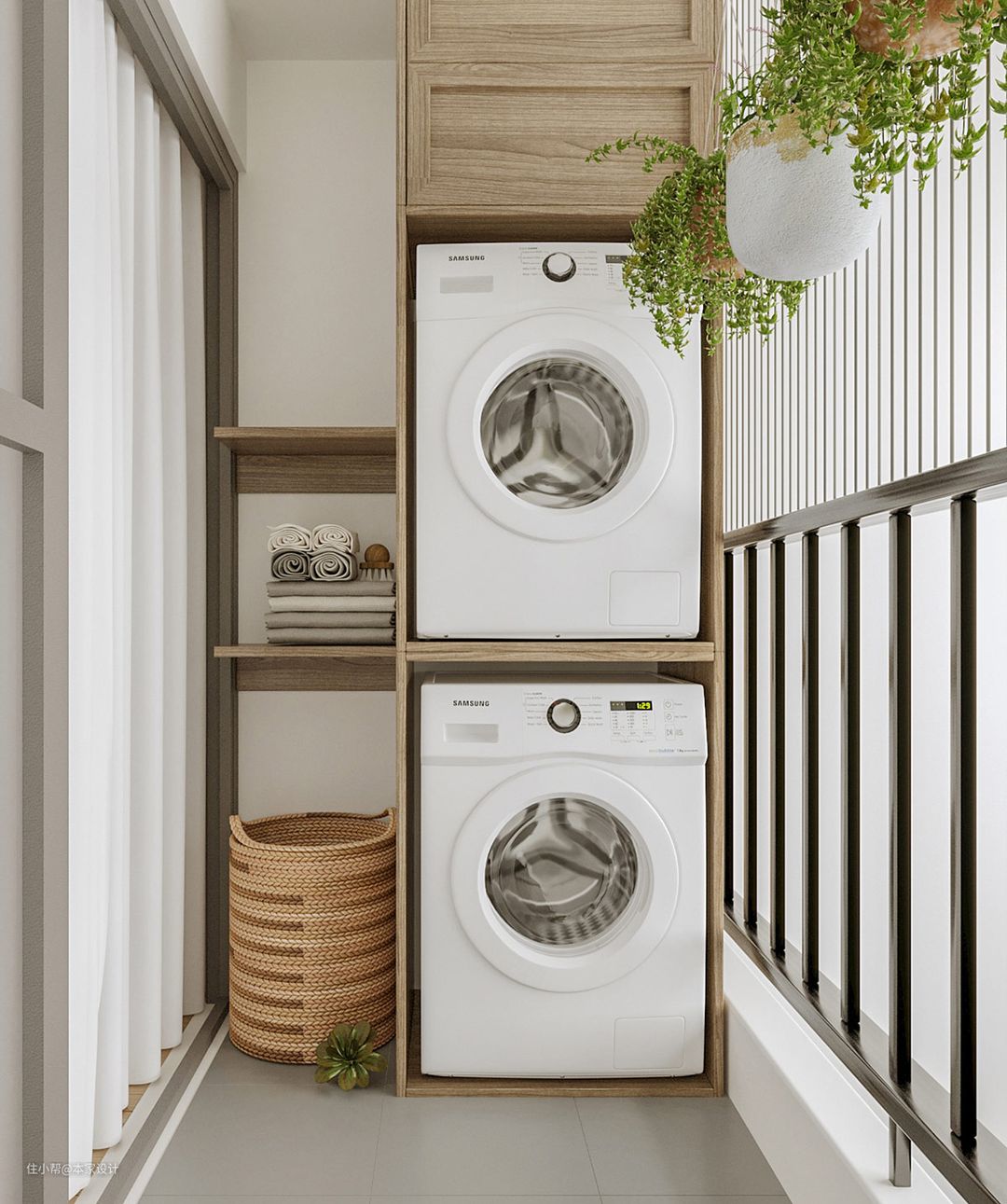带顶棚的阳台被用作洗衣区,配有堆叠式洗衣机和滚筒式烘干机。橱柜可以存放清洁剂,而开放式搁架则提供了一个折叠和堆放的地方。