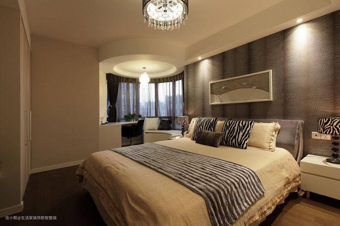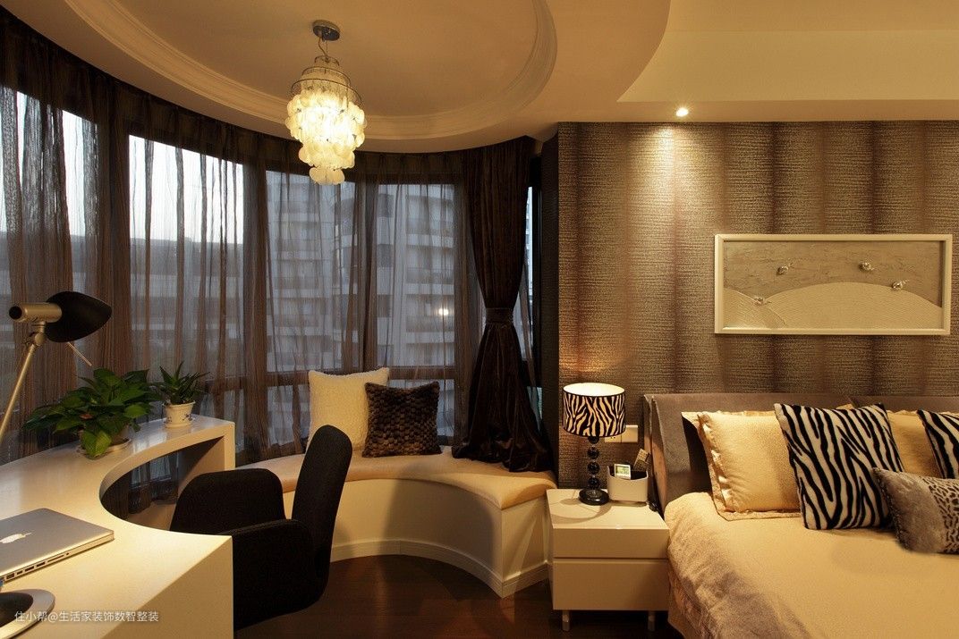主卧室的窗是圆弧型的,设计师利用了其特征做了休闲卡座,半圆弧型的梳妆台/书写台,方便了业主的办公与梳妆,同时还创造了小休闲区。