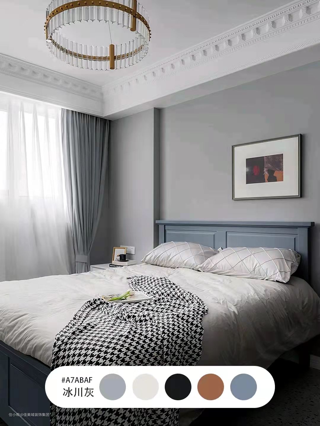 4、冰川灰:冷调的灰,与烟灰色背景墙完美过渡,和雾霾蓝家居搭配起来,有一种柔和优雅的观感,还可以使用一些金色或者橘色的饰物进行小范围点缀,撞色更有惊喜感。