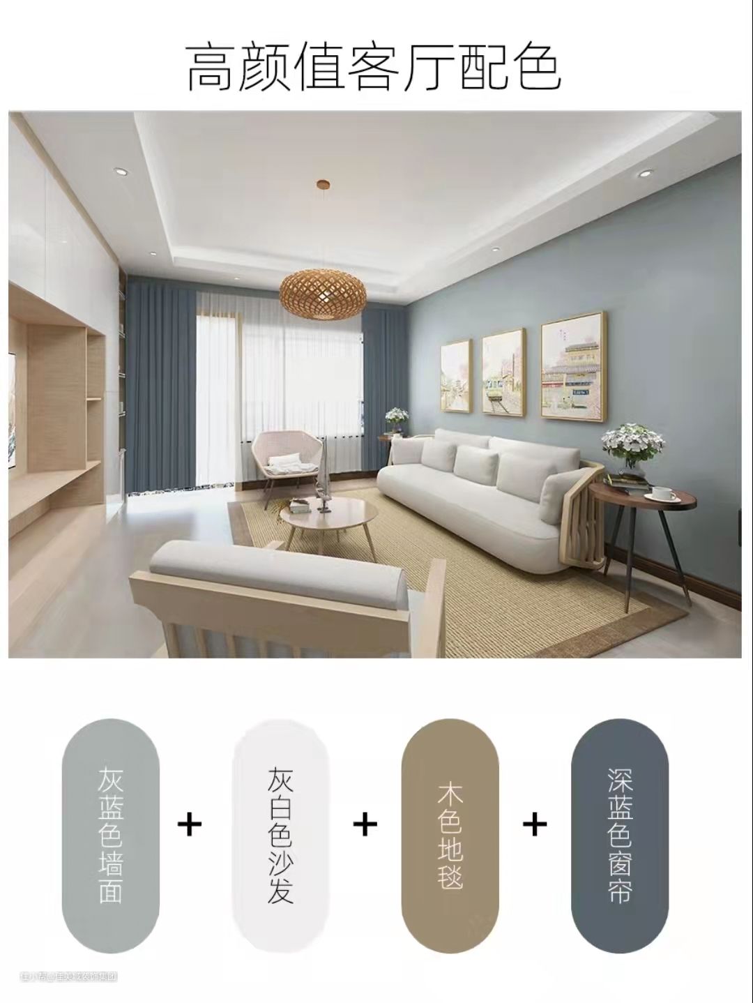 2、灰蓝色墙面+灰白色沙发+木色地毯+深蓝色窗帘