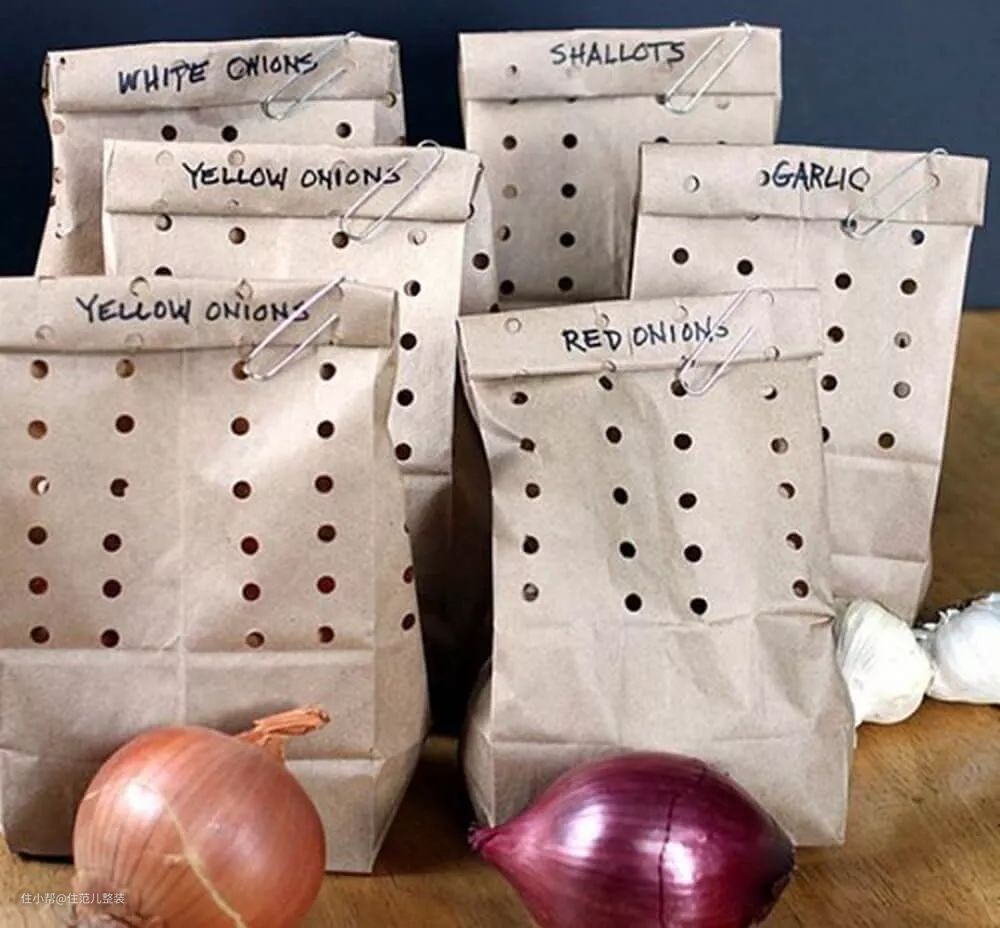 一些皮比较厚,水分比较不易流失的蔬果,可以用透气的布袋、牛皮纸袋来存放。