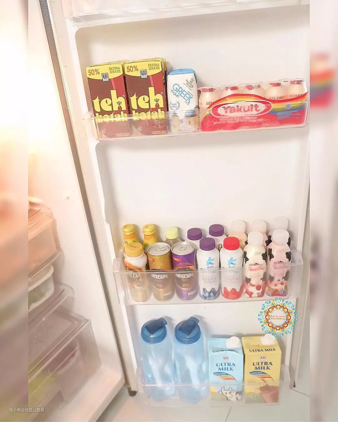 常常是饮料、盒装牛奶和调味料等放在门架上,显得整齐有序。