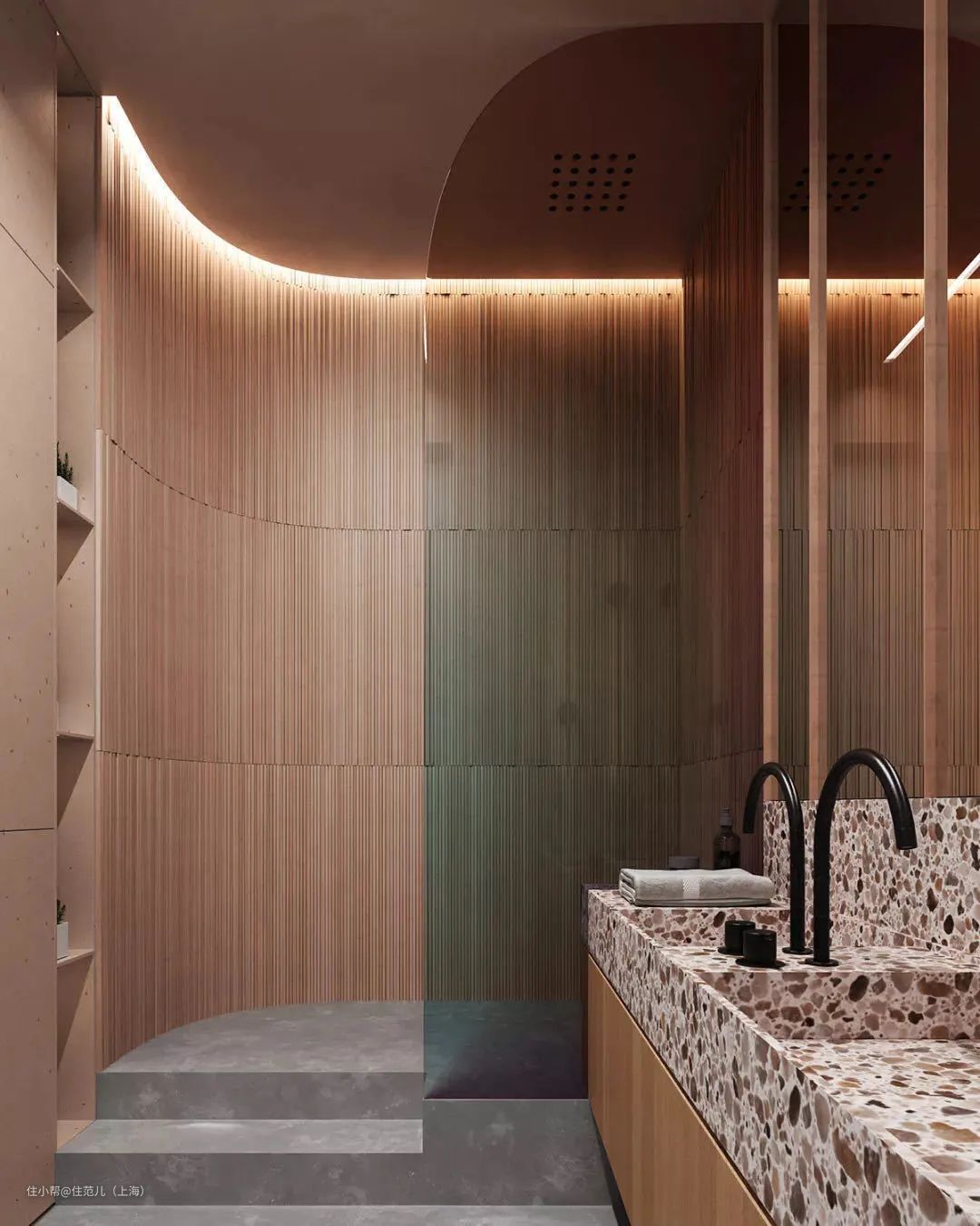一体式陶瓷盆+挂墙式浴室柜组合,简直是卫生间死角终结者。