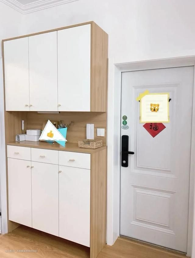 ⑴在与入户门垂直方向新建墙体,鞋柜与墙体相结合做成“嵌入式”鞋柜。将新建墙体与它周围的墙体使用相同的处理手法,可以增强鞋柜与家庭空间的统一性,不会让鞋柜有“硬塞入”家庭环境的尴尬感,整齐、利落。鞋柜的款式根据自己的功能需求进行选择。
