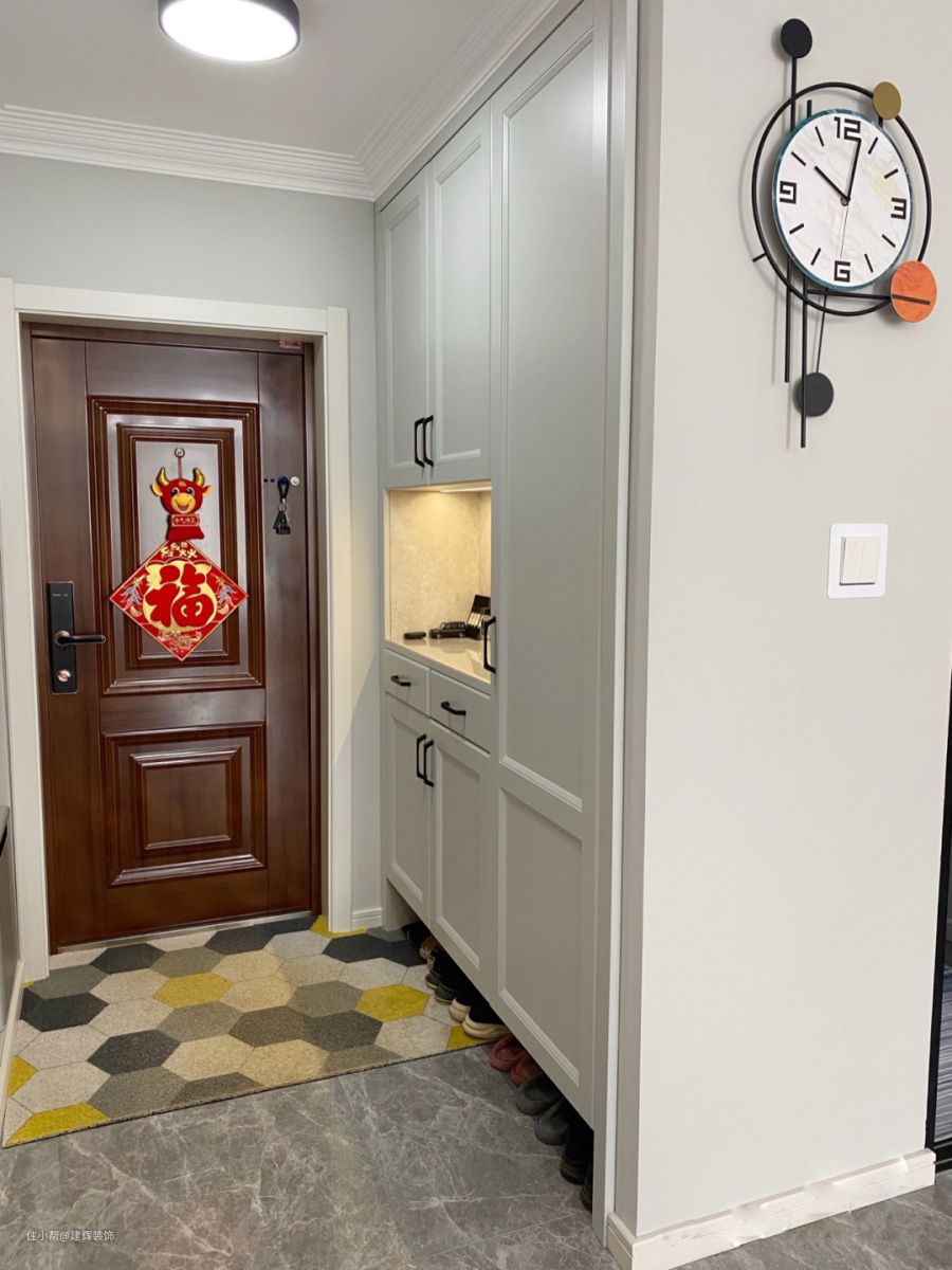 其实属于比较常见的公寓类型。它从入口有一个独立的入口。根据入口空间,考虑到恰好是旁边的厨房,将原墙敲掉,做了一个上下两层嵌入式的鞋柜,可以弥补原墙,更合理的利用入口空间。如果家里的入口也是这样,建议你去了解一下。鞋柜底部有一个空白处,一些常用的穿鞋可以非常方便的存放。把这双鞋打理得井井有条,真是太棒了,细节考虑得非常周到!