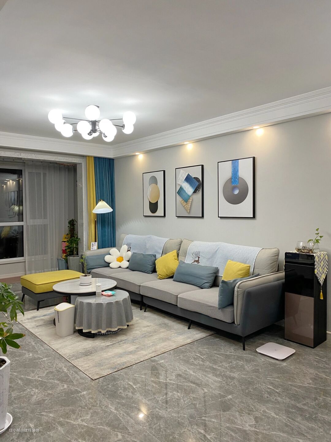 做了客厅电视背景墙,涂了蓝色乳胶漆,然后用木条做了一些简单的形状,类似石膏线条的效果。电视直接挂在墙上,可以为电视柜节省提供一些空间,让它更安全。从沙发的角度看电视刚刚好,比较符合人体工程学,我觉得挺好的!吊顶吊灯很喜欢,高颜值,晚上照明亮度充足!