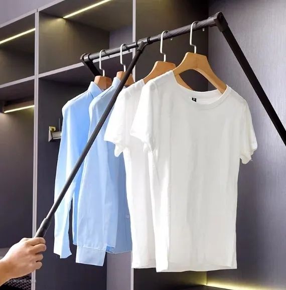衣柜悬挂区域的高度,得根据自身的高度去考虑,但衣服很多的话,需要更强的收纳能力,可以配合下拉气撑挂杆,把挂杆一路安装到天花板。