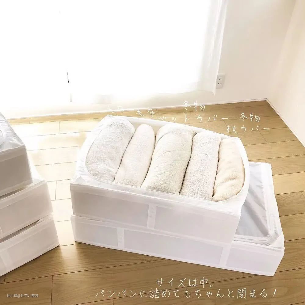 过季衣服和换下来的四件套不一定全都放在抽屉里,衣柜顶层、床底等不方便拿取的位置,都可以参考。