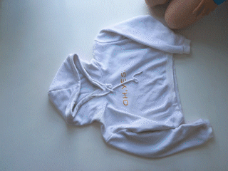 跟毛衣的方法差不多,袖子交叉折叠,把衣领部分塞进折上来的口袋就完成了。