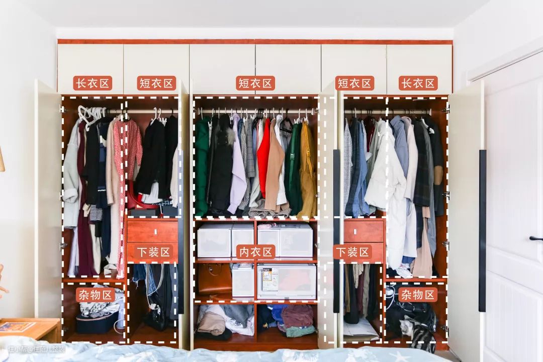 一般来说,衣柜的分区大致分为挂衣区、层板区和抽屉区,分区不同,存放的衣物也不一样。