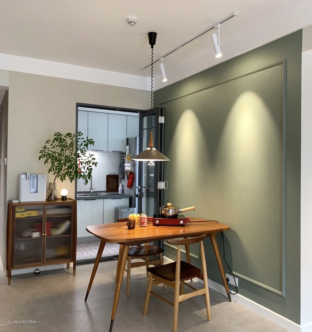 刷了一面橄榄绿的乳胶漆,通过墙漆将餐厅在视觉上独立出来,墙面设计了一圈石膏线,简洁的同时增加了层次感。