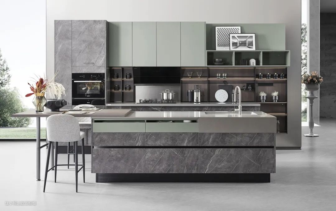 入眼即高级,采用开放式厨房设计,让空间宽敞透气,不会显得逼仄拥挤,很适合多人家庭使用。在配色上,灰色调与淡绿色调浅浅交融,淡绿冲散了灰调的黯淡,而灰色的出现又加入一丝成熟稳重气息,整体空间明亮又高雅,大气十足!