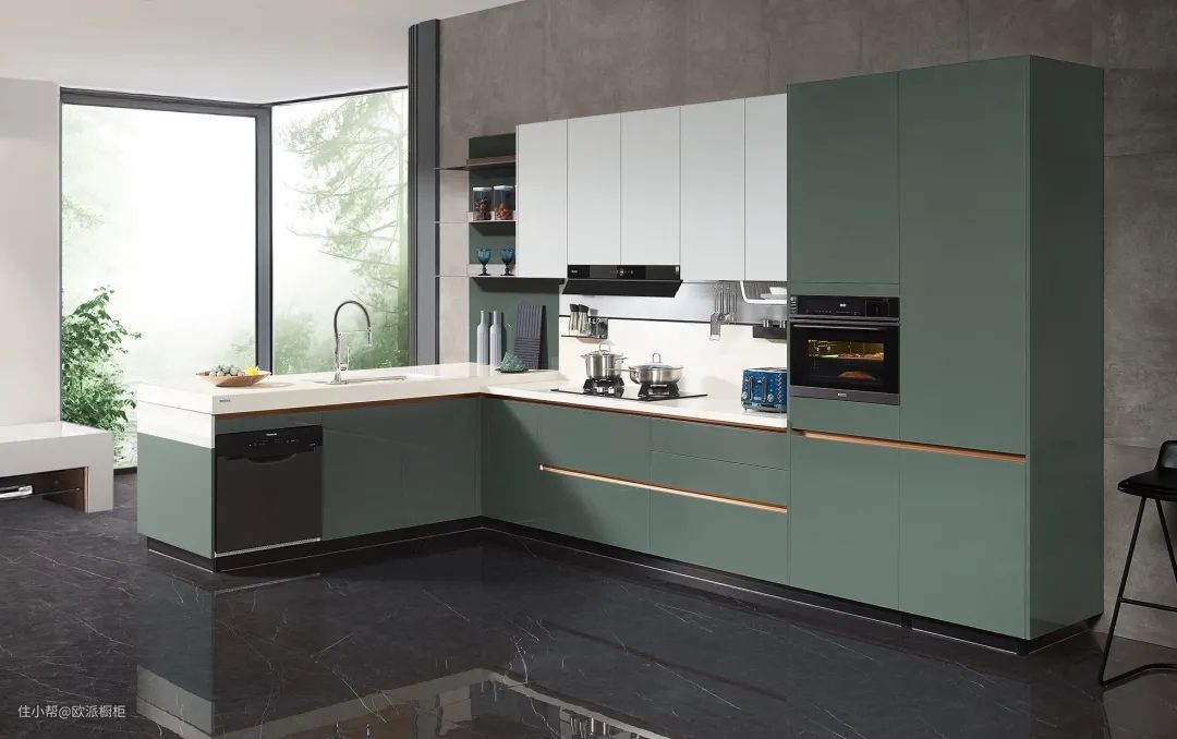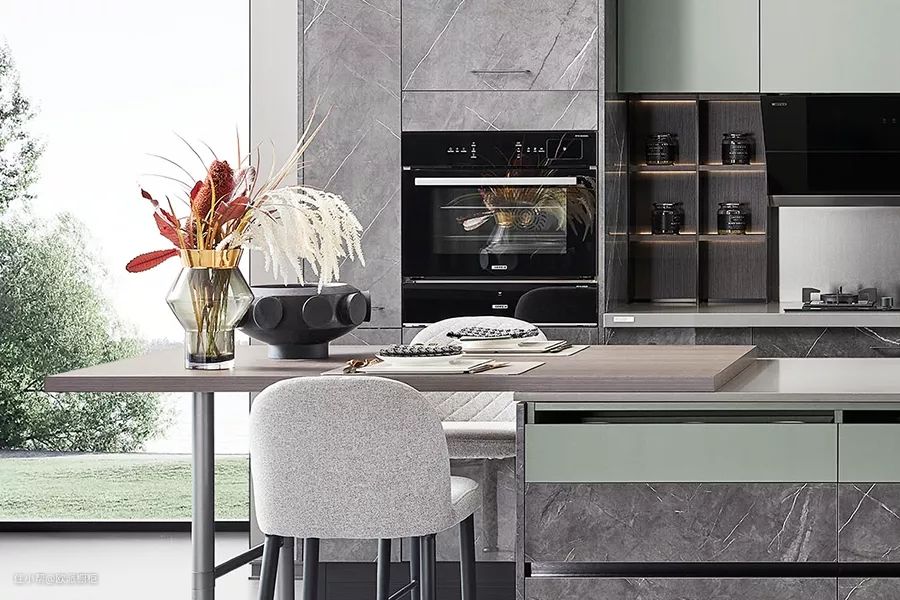 整体色调清新自然,是厨房中妥妥的“气氛组”,它采用超晶板材,本身亮面效果极佳,再加上流光四溢的暗金绿色,呈现令人砰然心动的光感色彩,让下厨的人也感到舒适自在,两口之家搭配下厨,生活有滋有味!