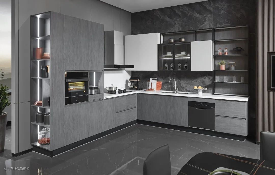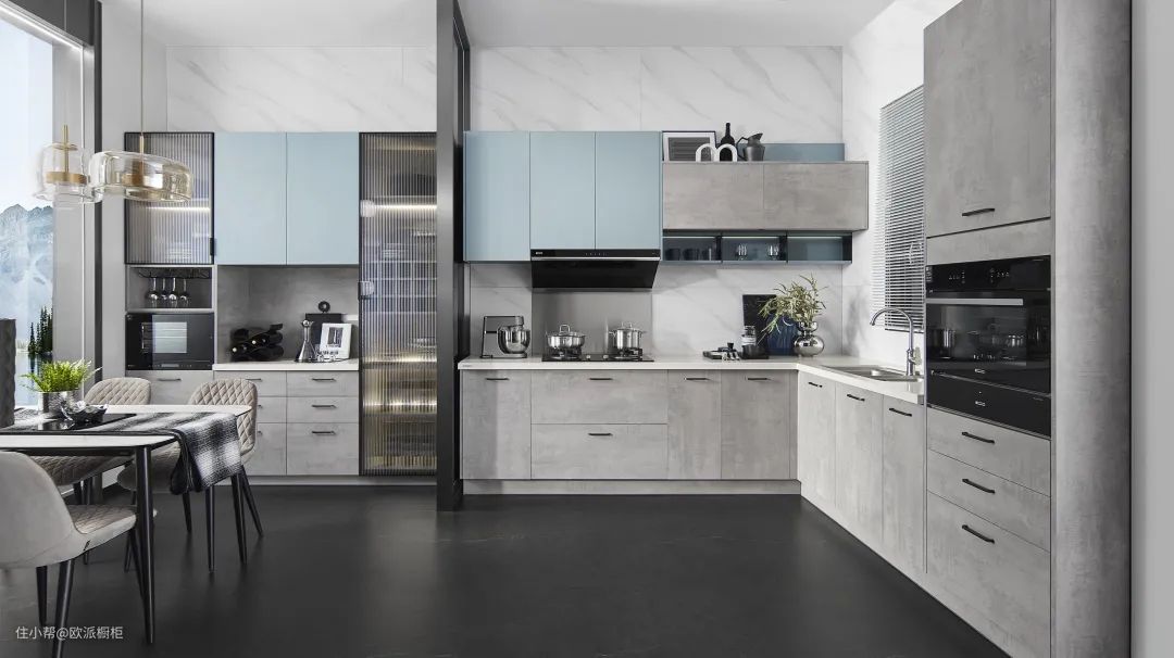 下面这款是典型的L型布局,合理划分洗涤区、备餐区、烹饪区三区,符合厨房里的黄金三角动线原理,使得操作动线流畅,在有效实现厨房空间的最大化利用时,提高下厨舒适度。