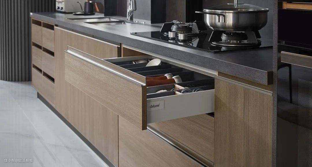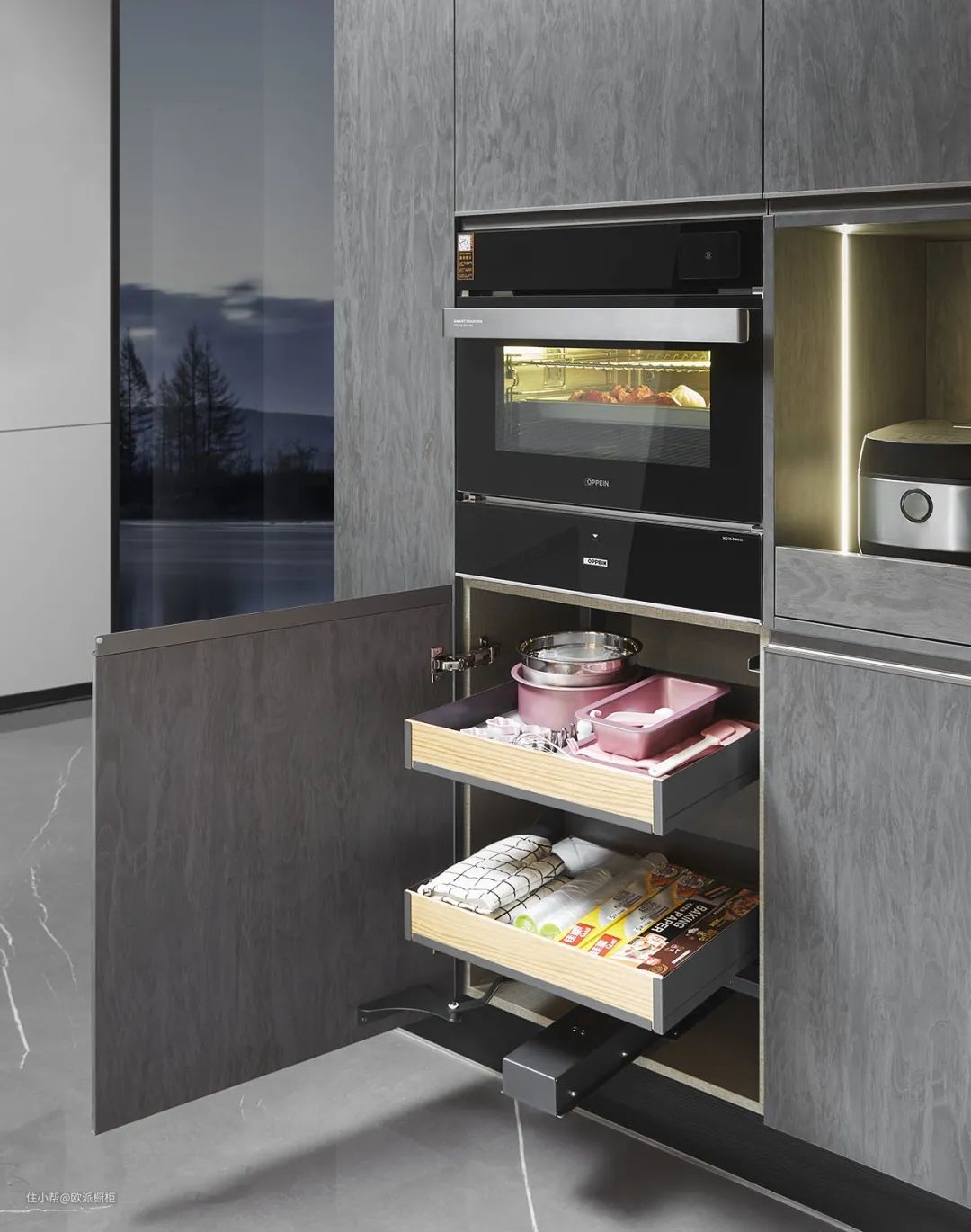 在这款中,收纳成为主角,联动拉篮、小家电收纳柜纷纷登场,联动拉篮打开柜门即自动弹出,轻松又省力;小家电收纳柜既能用来收纳小家电,又能化身临时操作台。多收纳组合提升厨房使用便利性,是一个适合两人之家的高效厨房。