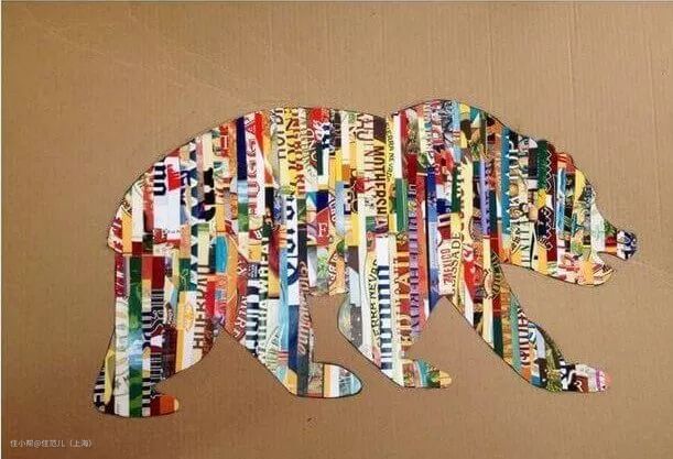 先在硬纸板上,把简易的动物形象画下来,再把剪成一条一条的杂志,黏贴上去。