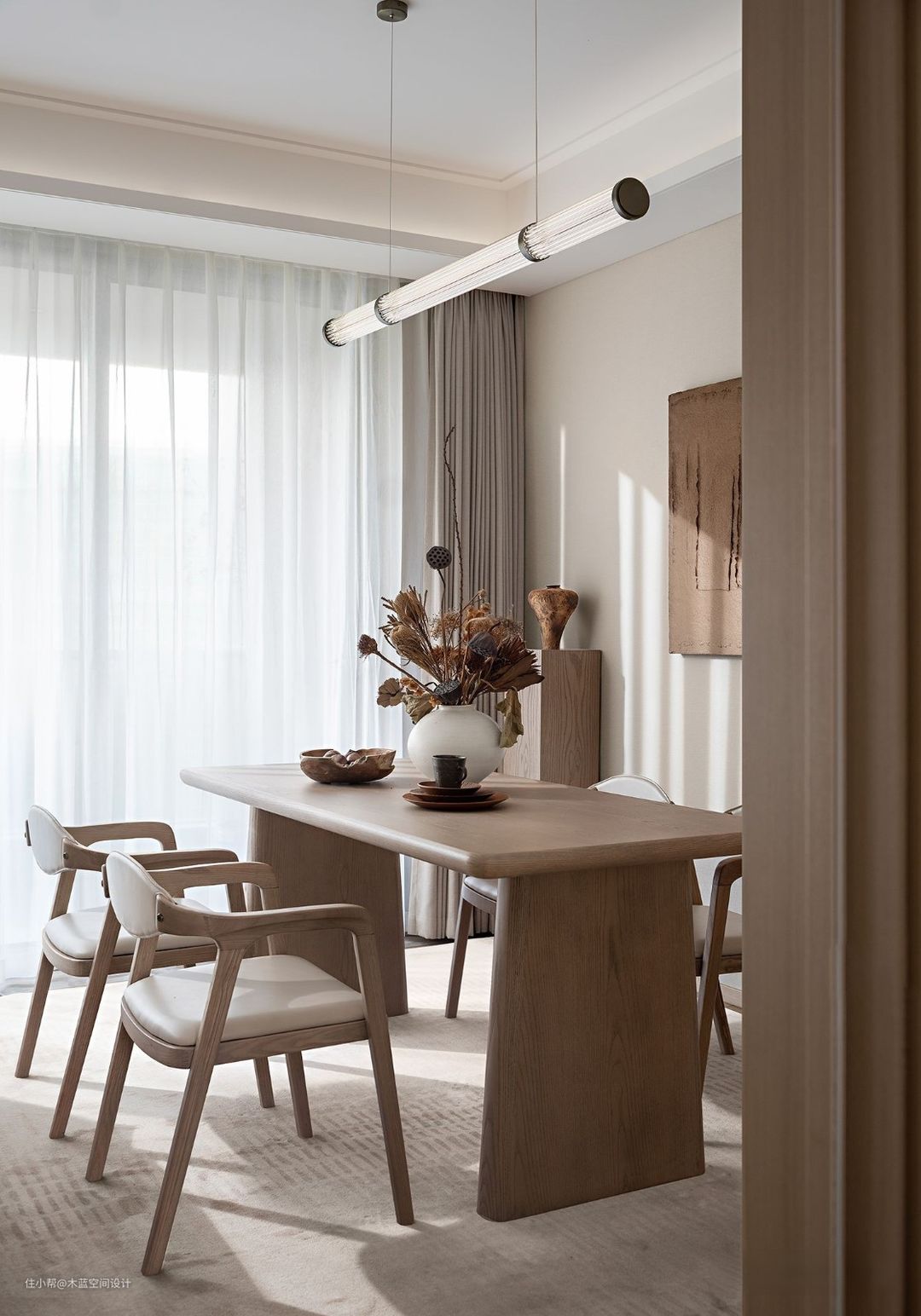 如果窗户一侧墙面没有安排其他家具,可以与客厅选择相同材质窗帘;如果安排了餐边柜,可以搭配百叶帘,透过光影,营造舒适就餐氛围。