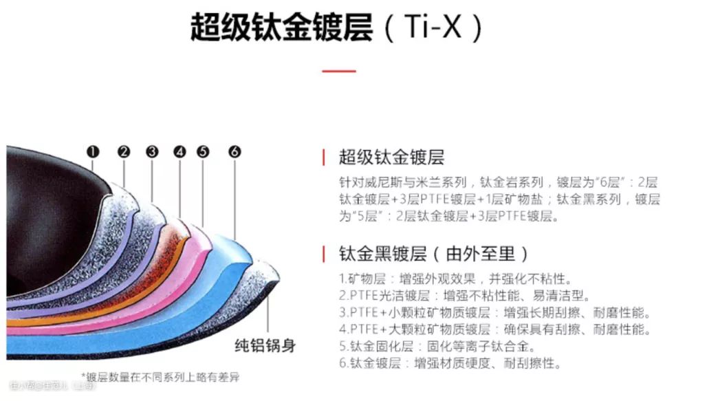 巴拉利尼的镀层介绍也很直接——大小颗粒的PTEE是不粘材料,钛金硬度大更耐磨抗造。