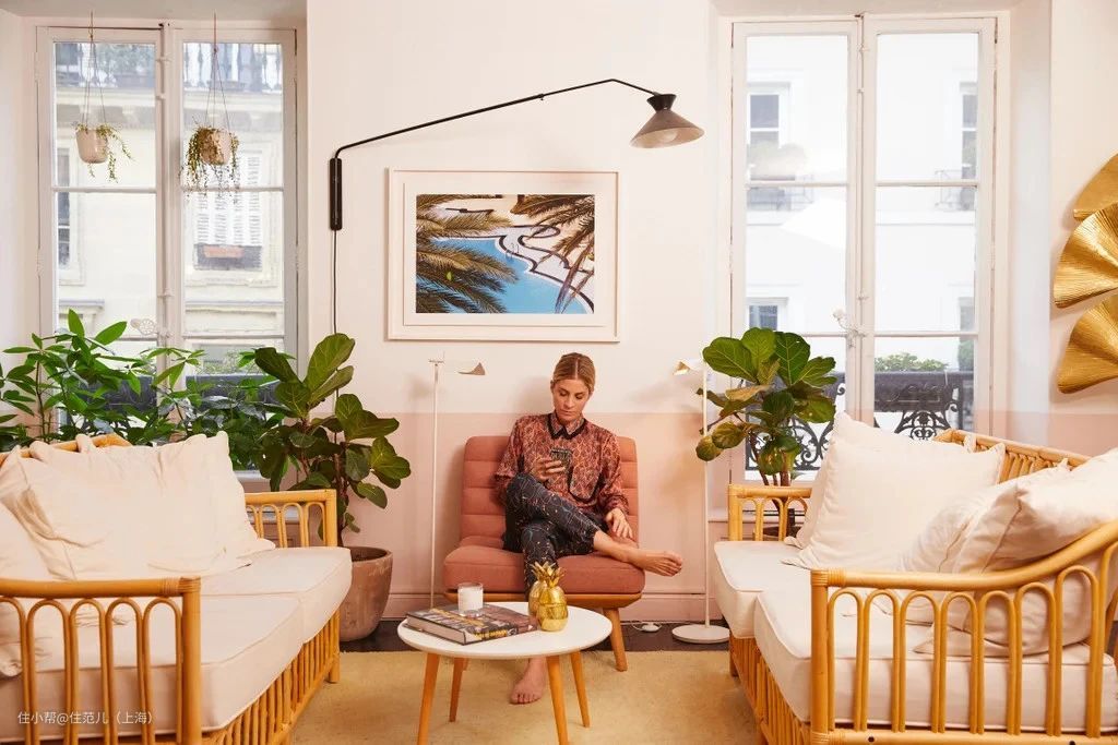 浅木色、粉色作为主题色,藤编沙发和大叶绿植带来度假感,金色大芭蕉叶非常亮眼,尤其值得注意的是她家灯光的层次。