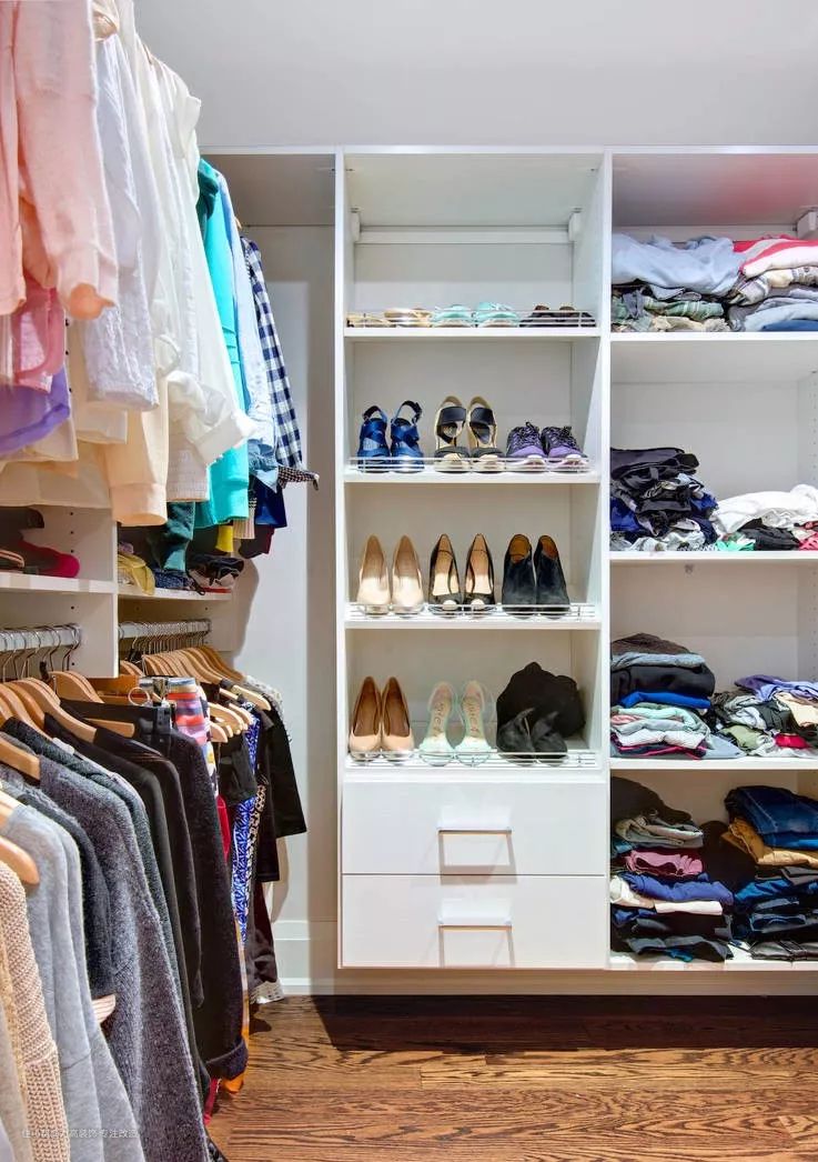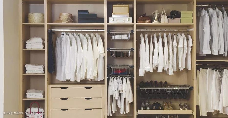 衣物空间分配秘笈1、衣物分类放置年轻夫妇的衣物是多样化的,一般将左右两边分别设置成男女方各自的储衣空间,柜体内的挂衣架通常分为长短两层分别储存大衣和上装,衬衫也可以放置于独立的小抽屉或搁板,不会因过多衣物挤压在一起而皱折难看。