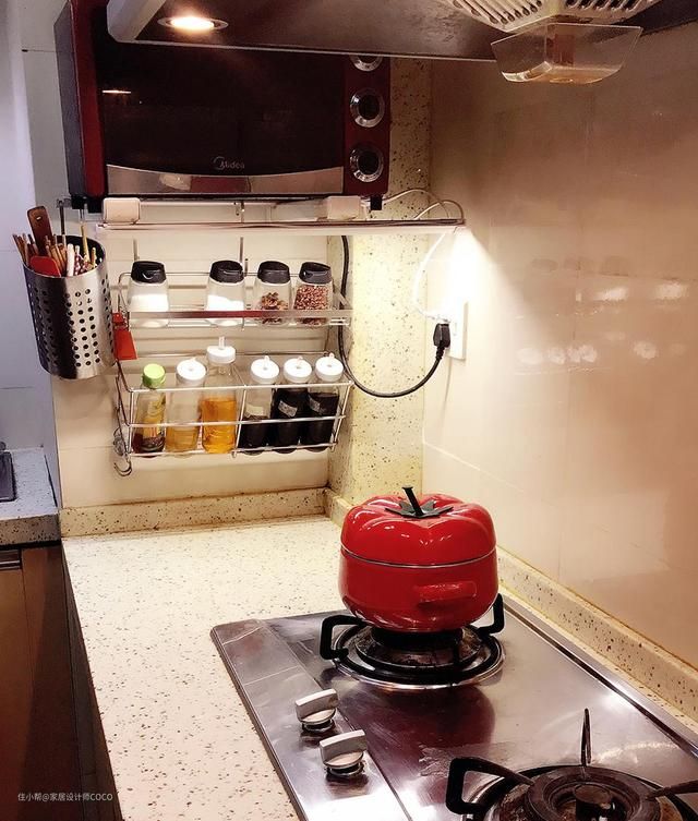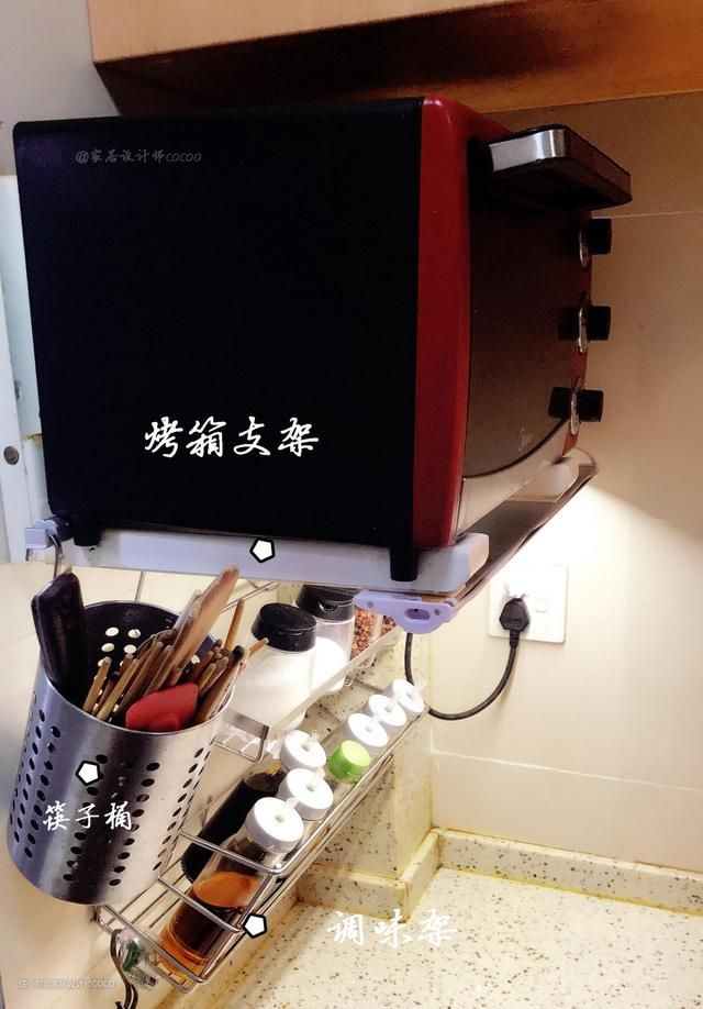 利用之前的烤箱架作为支撑,在下面挂了一个调味架和筷子筒,台面立马看起来宽敞了许多。