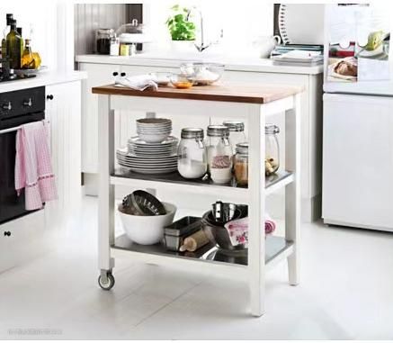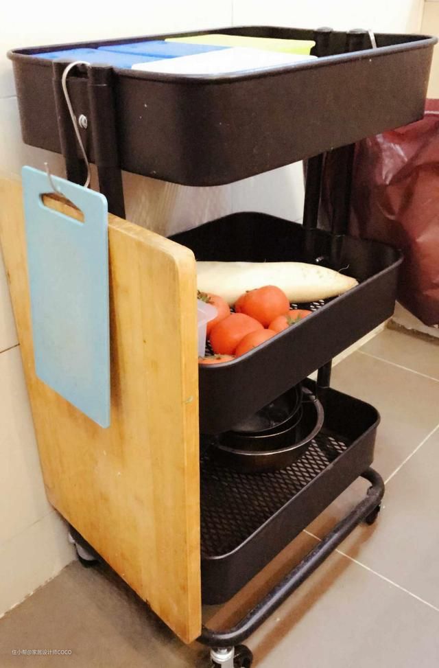 带滚轮的设计很实用,每次使用的时候,推到洗菜盆一侧,把案板放在最上边一层,这样一个独立的切菜区就实现了。