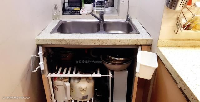 男主花了39元购买了一个可以伸缩的下水槽篮,让收纳能力增加了一倍,上下两层都可以放锅,一共收纳了五口锅+一个豆浆机+和面盆+大桶油,都不显得拥挤。